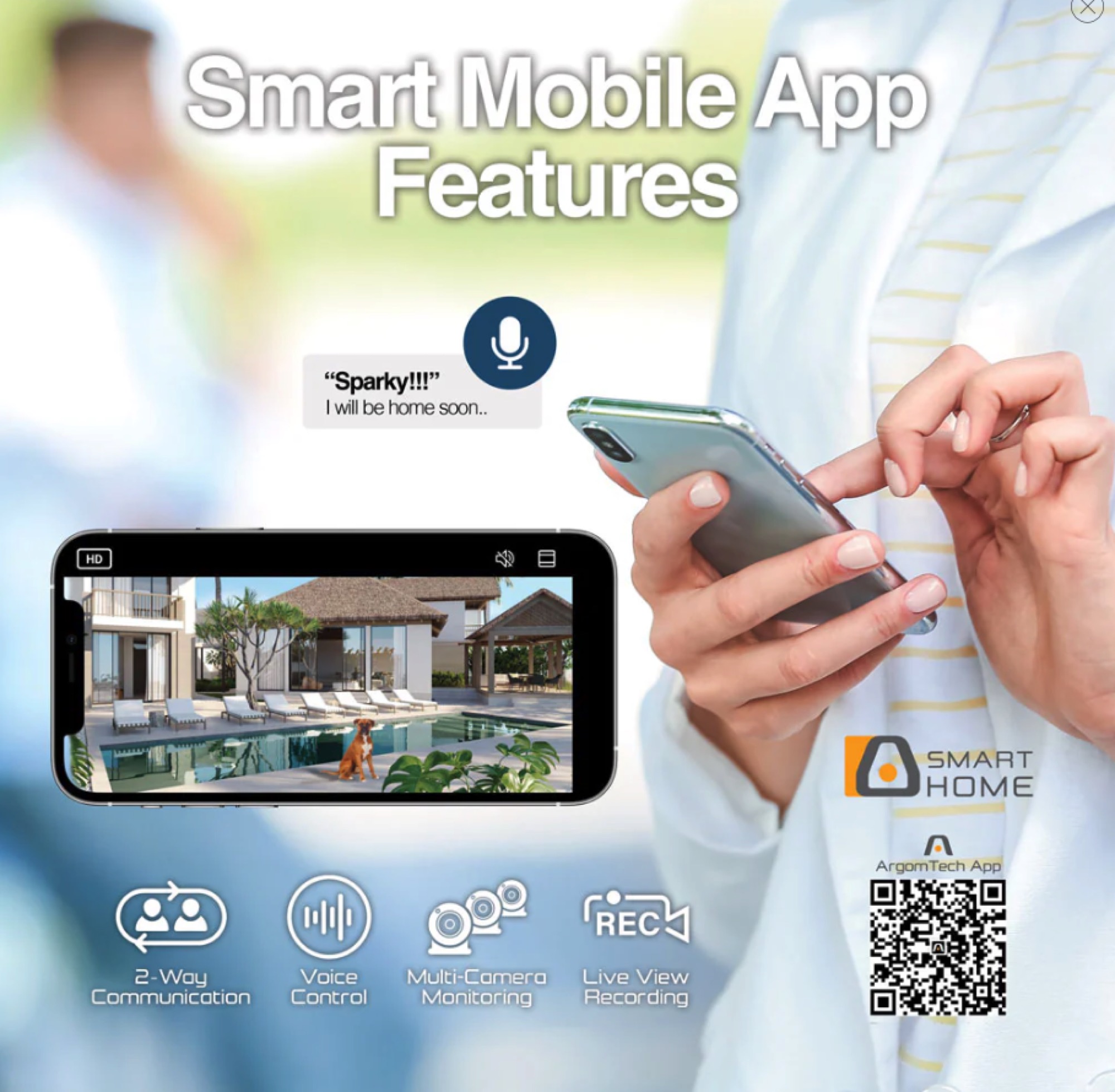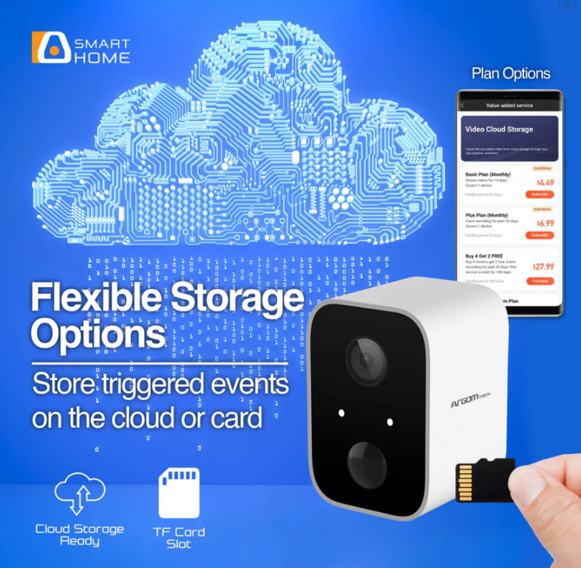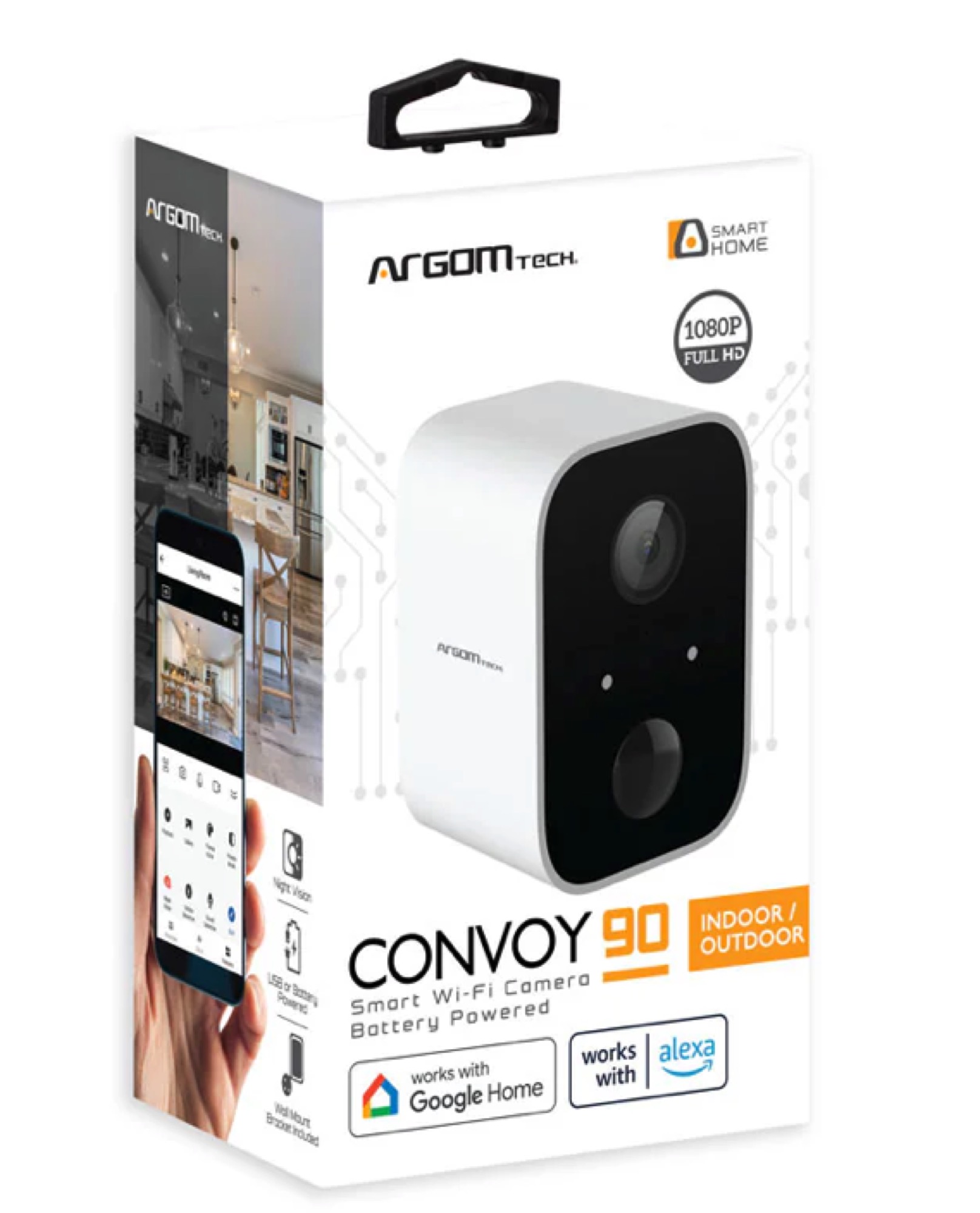 La cámara inteligente Convoy 90 con WiFi para interiores y exteriores, con batería, incluye excelentes funciones de seguridad como resolución FHD de 1080p, detección de movimiento, protección IP65 contra la intemperie, visión nocturna, comunicación bidireccional, compatibilidad con almacenamiento en la nube y mucho más. Sus versátiles opciones de alimentación la convierten en la solución de seguridad definitiva para interiores y exteriores. Puede usar la opción de batería o el cable USB tradicional. Ahora puede disfrutar de tranquilidad y seguridad en su hogar o negocio mientras está fuera. Use nuestra aplicación ArgomTech para monitorear todas las áreas de su hogar o negocio.
